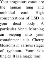 Musty hot dogs. Los Angeles. Interchangeable sexes of tongues and eyes. Sawdust in the sky. A small gas station in Pennsylvania. Radio sounds in the desert. Petrol over the lawn furniture. Grey-green cyanide capsules swallowed in secret rooms.